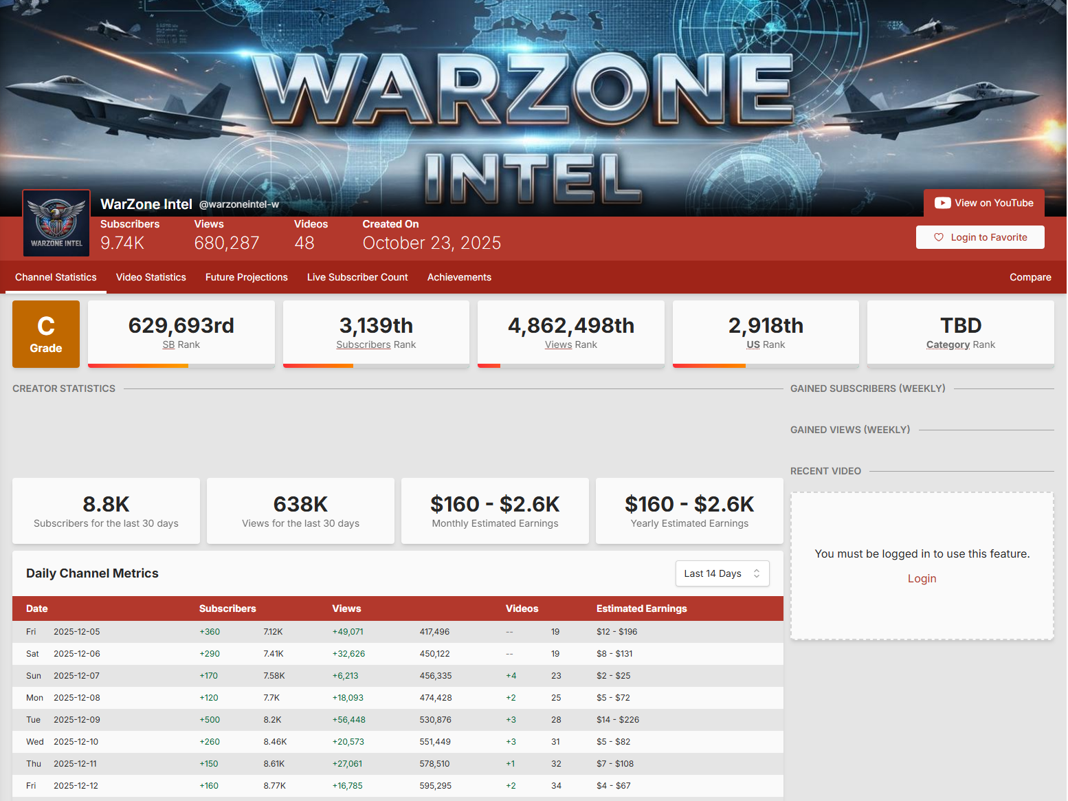 Channel Overview: Title: WarZone Intel Subscribers: 9.74K Total Views: 680,287 Videos: 48 Created On: October 23, 2025 Estimated Earnings (Last 30 Days): $160–$2.6K