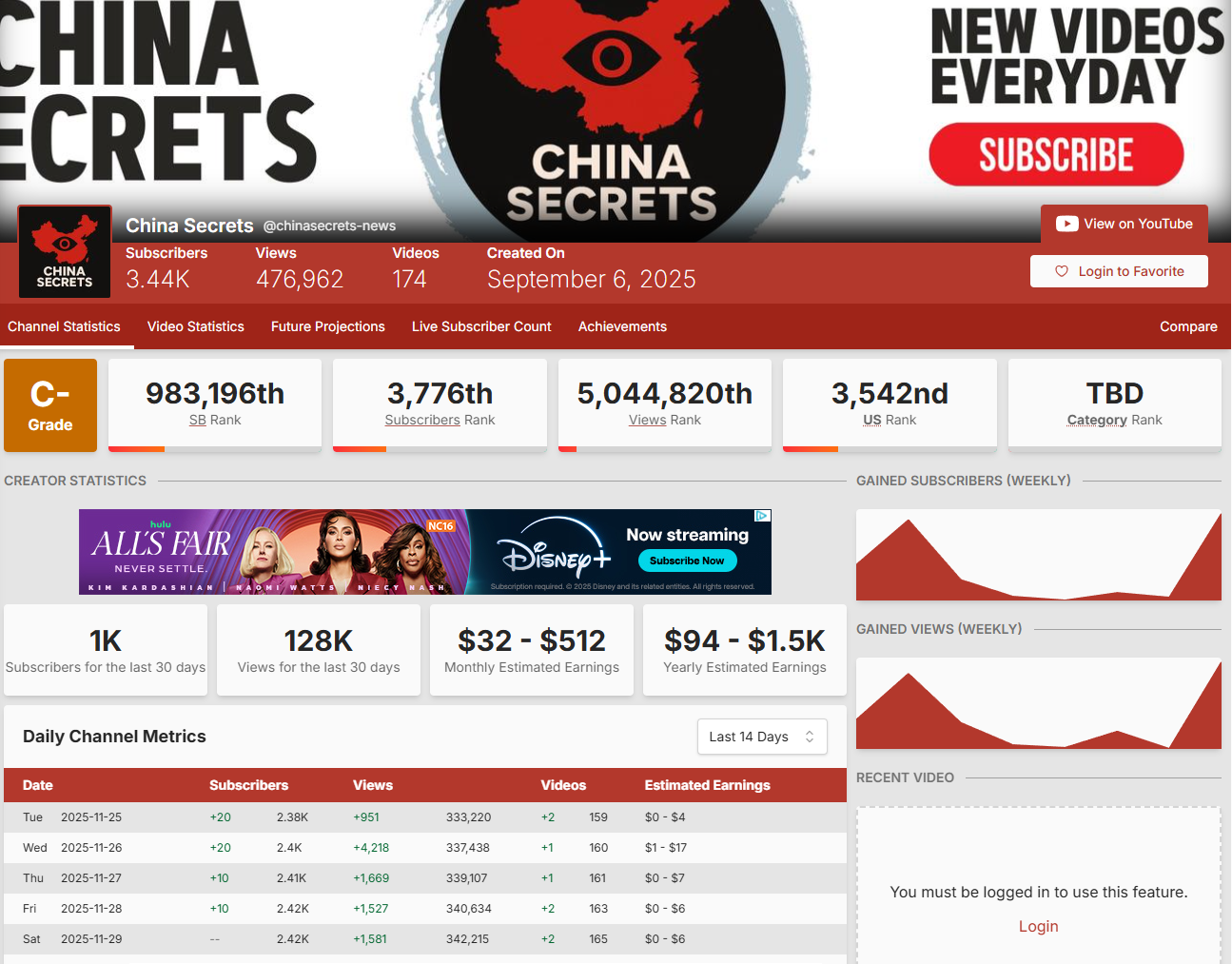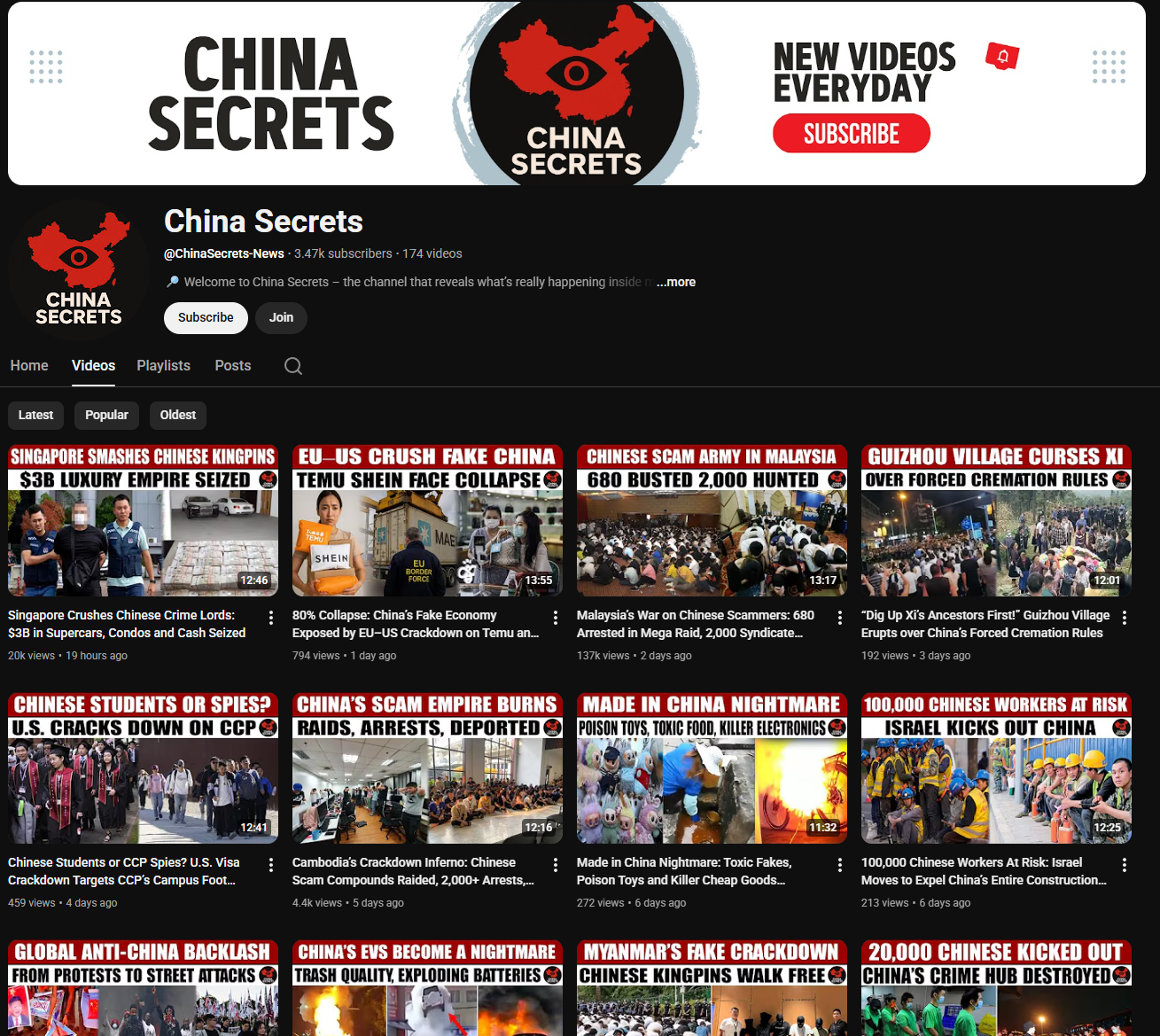 With 174 uploads already within 90 days of the channel’s creation, China Secrets is aggressively positioning itself as the daily faceless newspaper for global China incidents, leveraging: