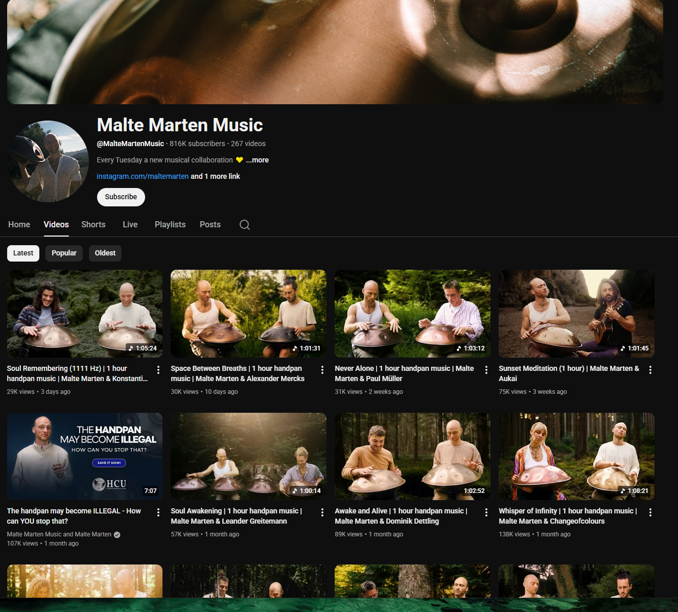 If you’ve ever watched a peaceful handpan video on YouTube, chances are you’ve seen Malte Marten Music. The channel has quietly grown into one of the biggest handpan music hubs on the internet—816,000 subscribers, 114+ million views, and 267 videos since launching back in 2014.