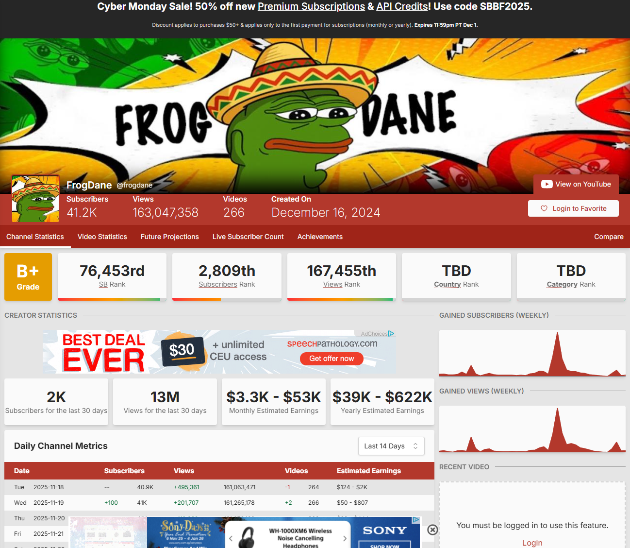 FrogDane started in December 2024. By August 2025, it hit $8.3K/month, with 141M total views, 37.5K subs, and a 99% profit margin.