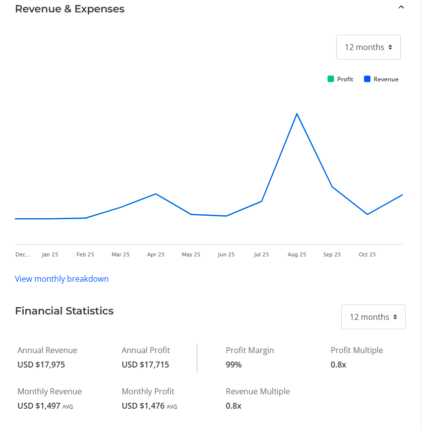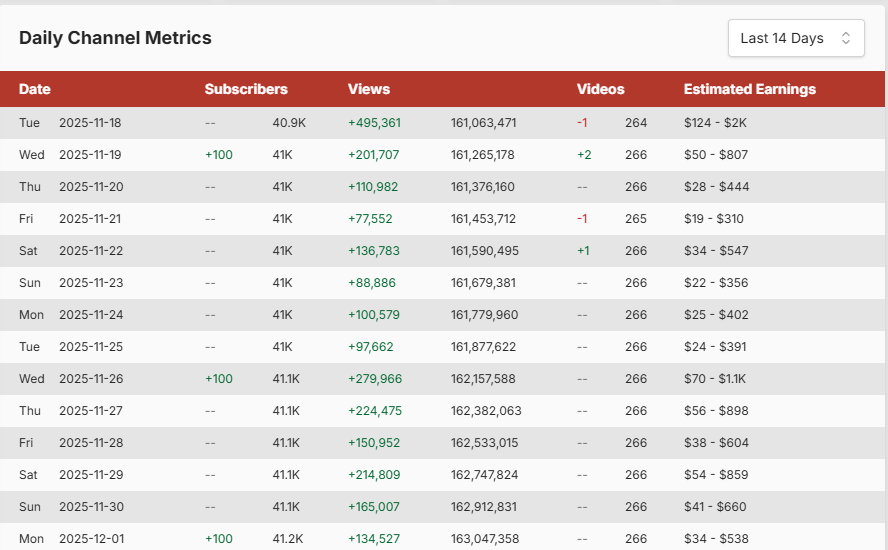 141M lifetime views × $0.20 = $28k+ potential revenue. Peak month: 8.3K USD. Average monthly profit: $1,476 with almost zero expenses.