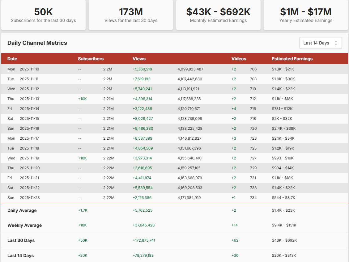 - $1M – $17M per year (SocialBlade)