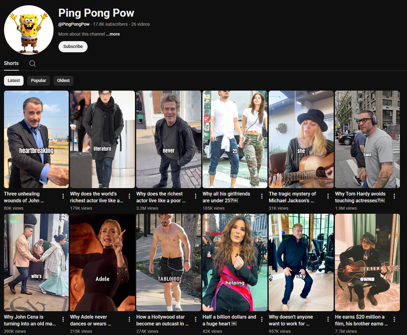 Channel formula: Ping Pong Pow mastered the “emotional curiosity loop” — short, faceless videos about celebrity secrets told in documentary-style narration. Each video mixes AI voiceovers, stock clips, and tabloid-style storytelling that plays like mini-Hollywood mysteries.