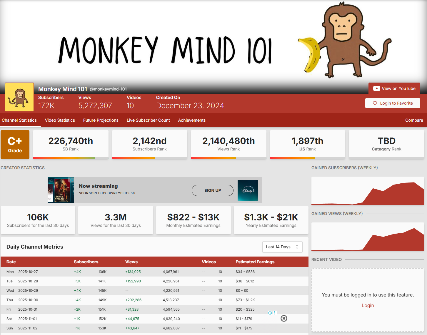Name: Monkey Mind 101 Launched: December 23, 2024 Uploads: 10 Subscribers: 172K Total Views: 5.27M Views (Last 30 Days): 3.3M Estimated Earnings: $16,915+ (based on $5 RPM)
