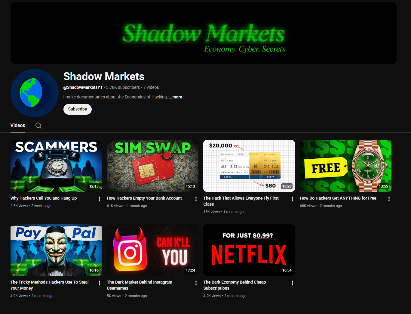 ShadowMarketsYT specializes in documentaries about economic hacking and black markets, presented with: