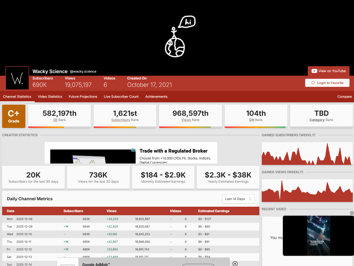 Observation: High CPM potential due to educational/science niche and long watch times.