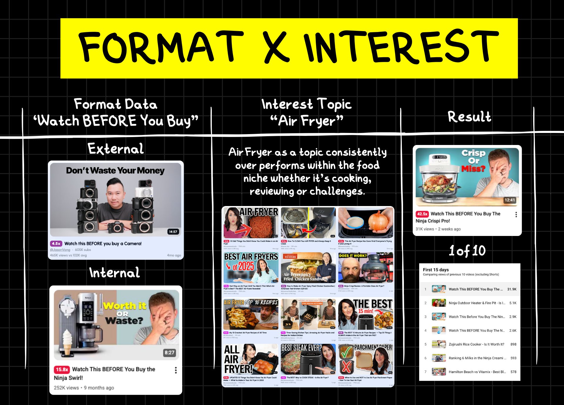 - INTEREST TOPIC: A niche that already overperforms (e.g., air fryers, microwaves, robots, travel hacks, etc.)